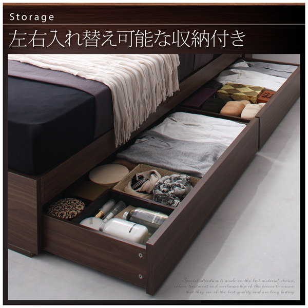 収納付きベッド【General】ジェネラルのベッドは、スペースを有効的に使える2杯の引き出しが付いた高級なデザインの収納付きベッドです。引き出しは、左右どちらにも取付可能です。この商品は、【フレームのみ】シングルタイプです。
