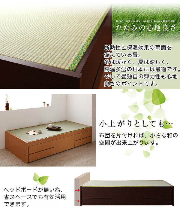 日本製 畳仕様 チェストベッド【翠緑】すいりょは、畳を使用した床下に大容量の収納引き出し付きのチェストベッド。ヘッドボードを無くすことでとてもシンプルな収納付きベッドになりました。小上がりとしても使用可能です。この商品は、 シングル【国産畳】タイプの商品です。