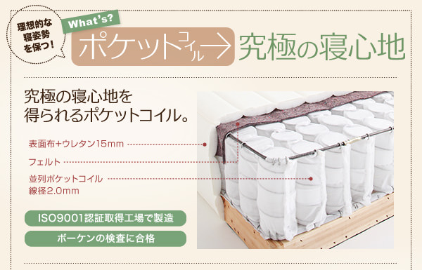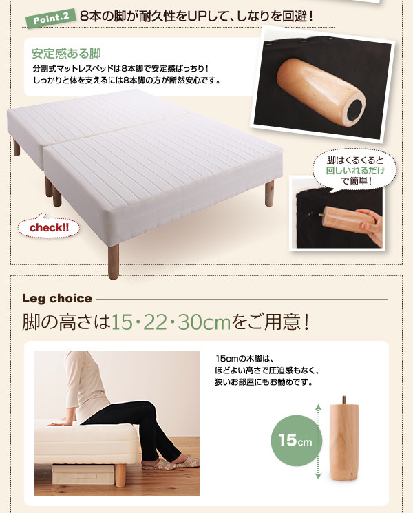 移動ラクラク!分割式マットレスベッドは、ダブルサイズでも移動が楽にできる!便利な分割式のマットレスベッドです。ボーケンの検査にも合格の高品質!品質にも自信があります。ISO9001認証取得工場での製造!脚もしっかりとした6本脚。脚の高さは15cmと22cmと30cmをご用意。お好みの脚をお選び頂けます。この商品は、ポケットコイル 脚15cm ダブルタイプです。