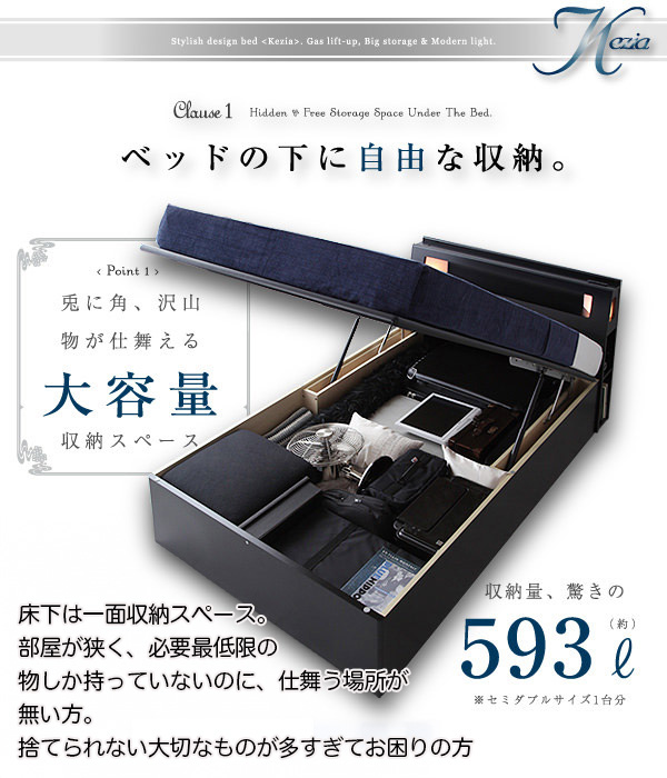 跳ね上げベッド【Kezia】ケザイア は、女性でも簡単片手で開閉可能な跳ね上げベッドです。マットレスを乗せたまま開閉が可能な跳ね上げ式ベッド。お部屋が狭くクローゼットが荷物で一杯という方に大人気です。この商品は、スタンダードボンネルマットレス付セミシングルサイズです。