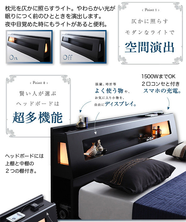 ヘッドボードには上棚と、中棚の2つの棚付き。