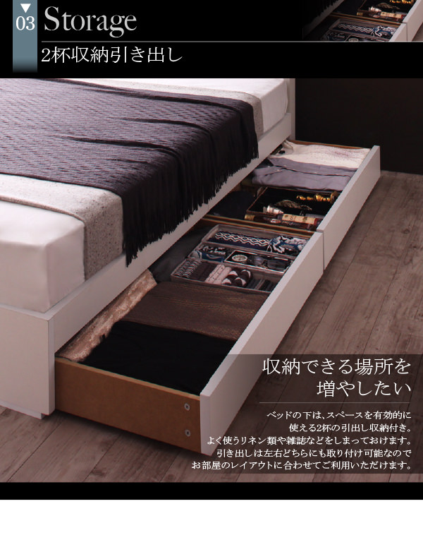 ベッドの下は、スペースを有効的に使える2杯の引出し収納付き。