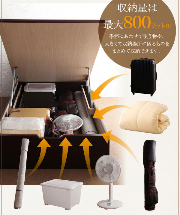 跳ね上げ式対応のベッドは、小物はもちろんスーツケースや布団等、収納問題は全て解決。