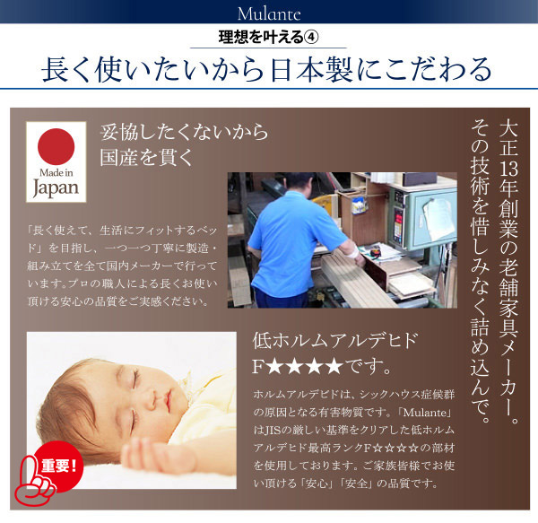 跳ね上げベッド【Mulante】は、JISの厳しい基準をクリアした低ホルムアルデヒド最高ランクF☆☆☆☆の部材を使用しております。