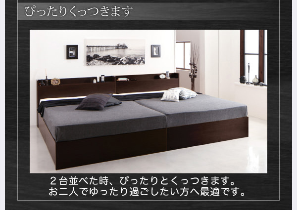 フラットなヘッドボードだから2台並べると、1台の大きなベッドのように見え高級感のある寝室になります。