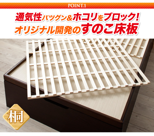 すのこの材質は桐。日本古来より家具の木材として親しまれてきた桐は吸放湿性に優れており、夏はさわやかな、冬はあたたかな寝心地を楽しめます。