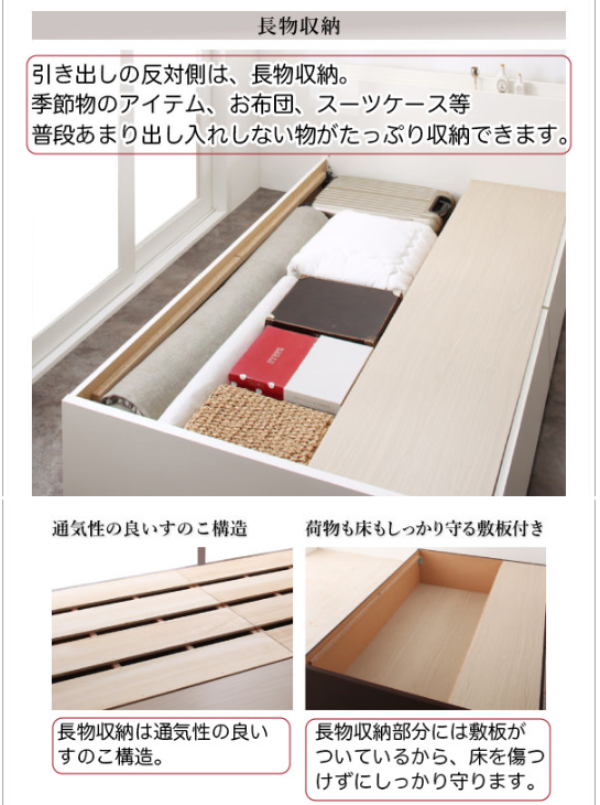 そのため収納に無駄がなくなり、同じサイズのベッドに比べ、収納力がUPします。