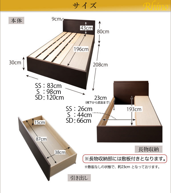 収納付きベッド【Rhino】ライノは、長く使えるよう頑丈で丈夫に設計された収納付きベッド。収納引き出しは、BOX構造を採用、頑丈でホコリ対策もバッチリ!組み立ても簡単です。長物収納は、すのこ床板で通気性抜群!この商品は、3ZONEポケットマットレス付 シングルサイズです。