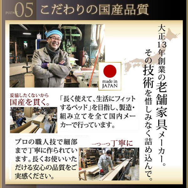 「長く使えて、生活にフィットするベッド」を組み立てをすべ目指し、製造・て国内メーカーで行っています。