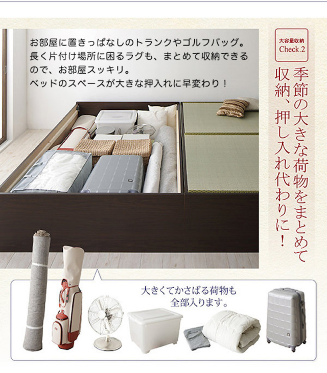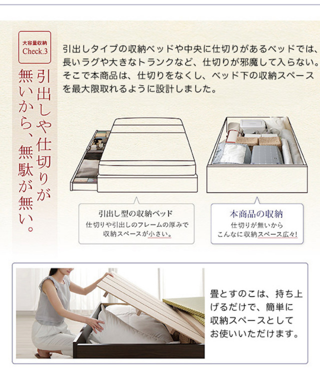 引出しタイプの収納ベッドや、中央に仕切りのあるベッドでは、長いラグや大きなトランクなど、仕切りが邪魔して入れる事ができません。