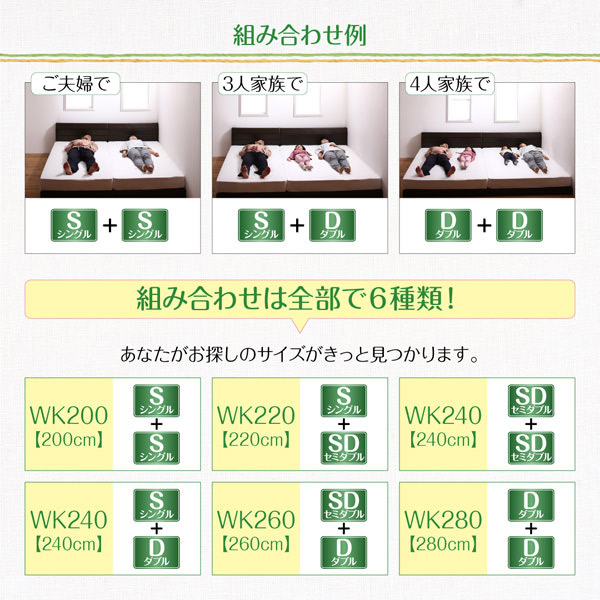 ファミリーベッド【Familiena】ファミリーナは、お子様の安全を第一に考えて作った連結可能なファミリーベッド。家族への配慮に満ちたヘッドボード。レザーとウレタンを使用し、怪我をしにくい構造になっています。この商品は、国産ボンネルマットレス付き ワイドK260(SD+D)タイプです。