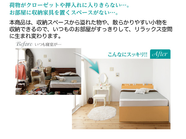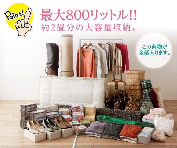 その為、構造に無駄がなくなり、同じサイズのベッドに比べ、収納力がUPします。