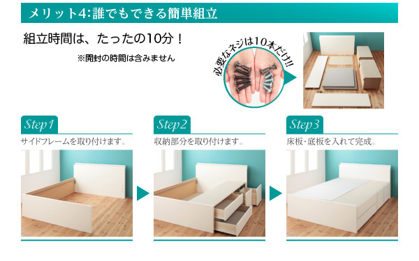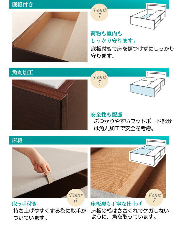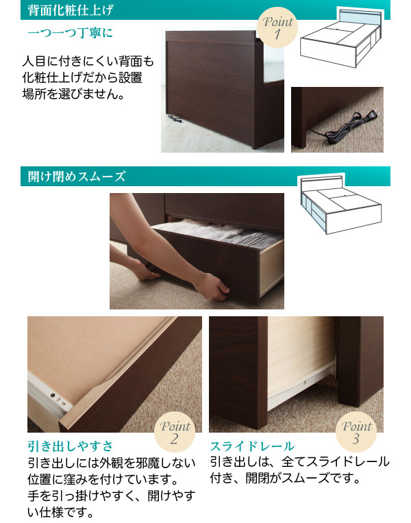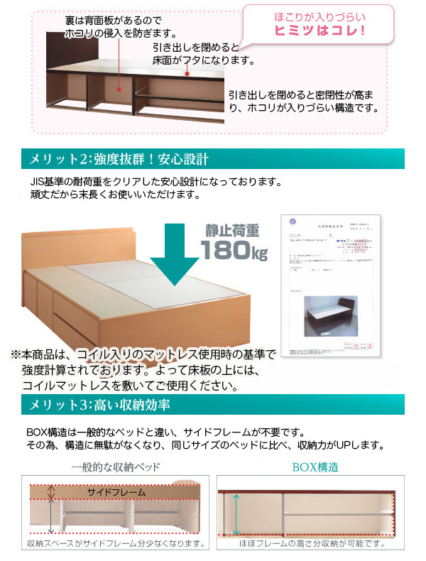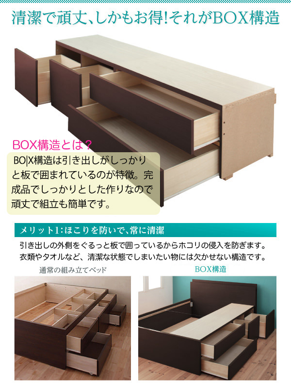 ほこり防止:タンスみたいにほこりが入らないベッドを探していました。このBOXタイプの引出しはまさに理想通りです。