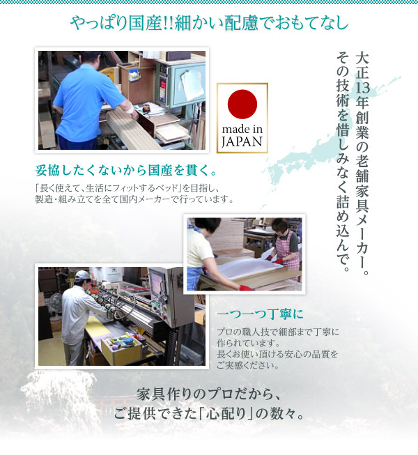 日本製:以前に安い海外製のベッドを買って大変な目に。ベッドは毎日使う物だから、やっぱり日本製が安心ですよね。