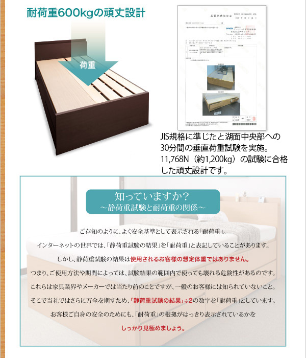 耐荷重600kgの頑丈で丈夫な日本製チェストベッド。長物収納部には、通気性を考えてすのこ板をしよう、他の収納引き出しには、丈夫でホコリ対策もバッチリのBOX構造を採用。組み立ても簡単!この商品は、薄型抗菌国産ポケットマットレス付 ダブルです。