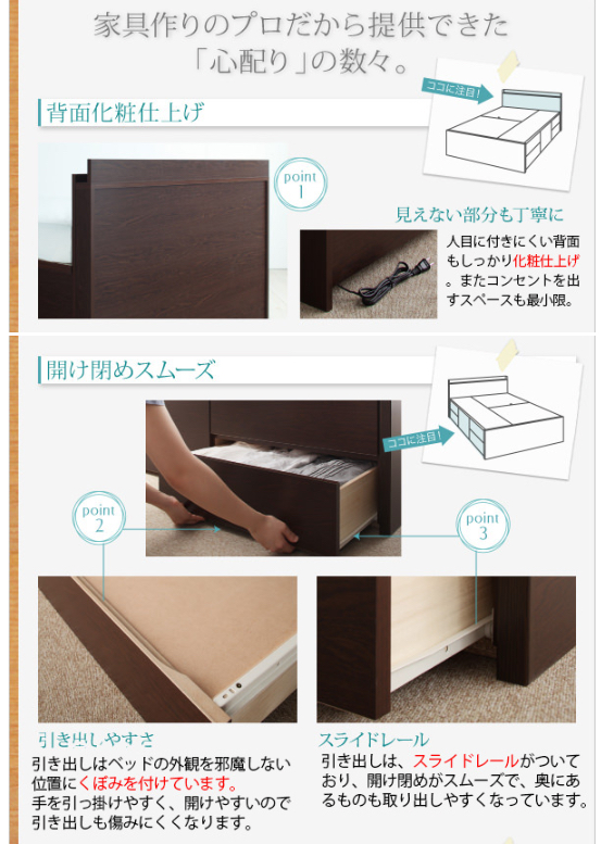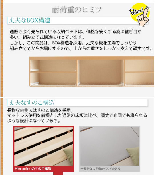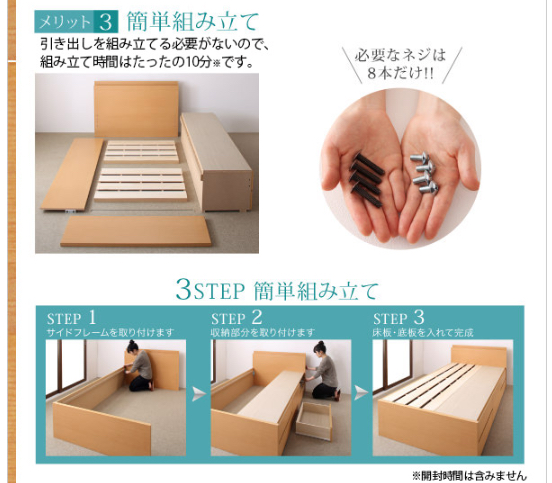 通販で良く売られている収納ベッドは、価格を安くするために引き出し部分は継ぎ目が多く弱い、組み立て式構造を使っています。