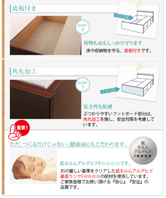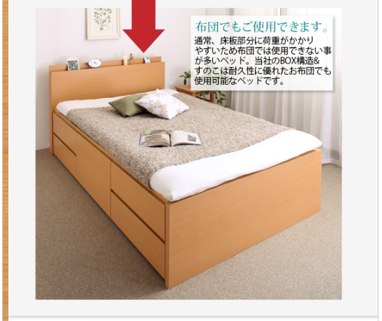 通常、床板部分に荷重がかかりやすいため布団では使用できないことが多いベッド。当商品のBOX構造&すのこは耐久性に優れた作りなので、お布団でも安心してご使用いただけます。