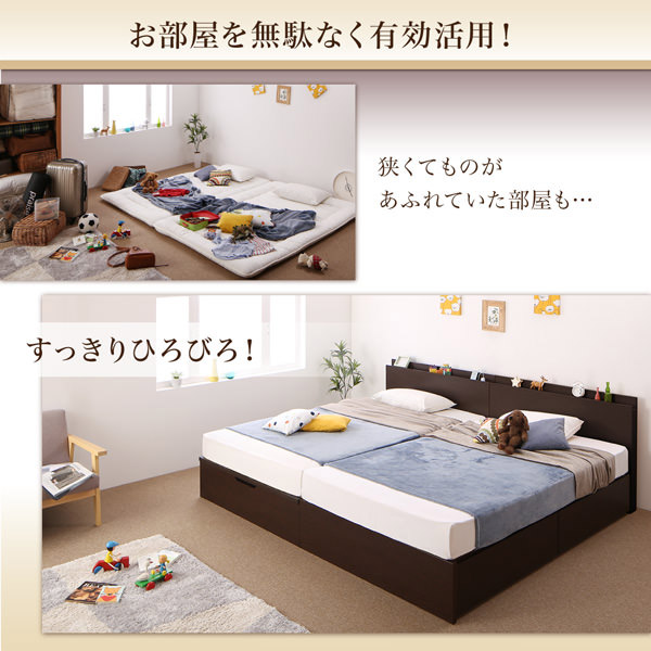 跳ね上げベッド【Kirchen】キルヒェンは、跳ね上げベッドと引き出し付きベッドを連結した、家族で寝れるファミリータイプの連結式ベッド。もちろん分割でも使用可能。さらに安心でファミリーに人気の国産品質。この商品は、スタンダードポケットマットレス付 A+Bタイプ ワイドK240(SD×2)サイズです。
