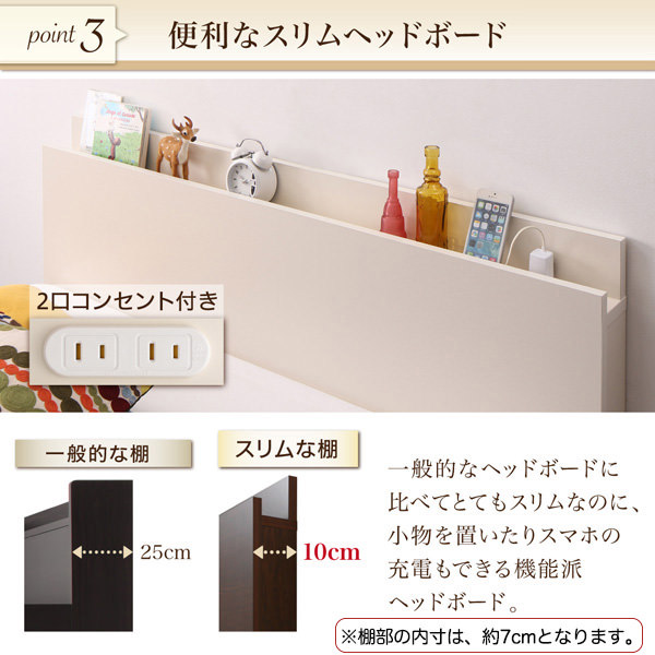 一般的なヘッドボードに比べてとてもスリムなのに、小物を置いたりスマホの充電もできる機能派ヘッドボード。