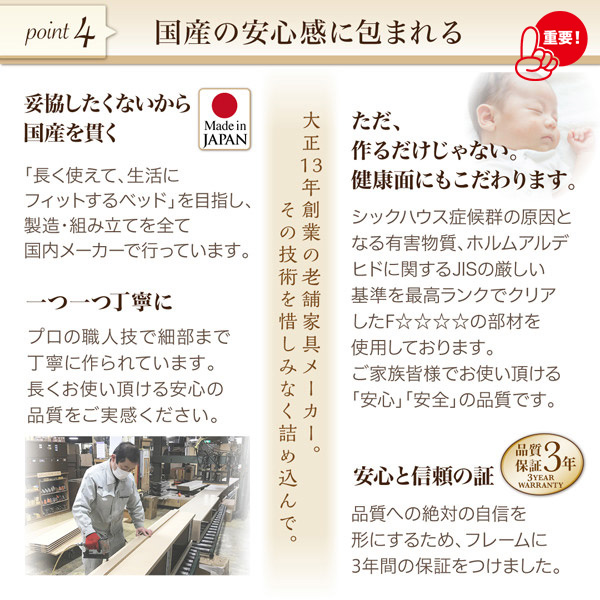 「長く使えて、生活にフィットするベッド」を目指し、製造・組み立てを全て国内メーカーで行っています。