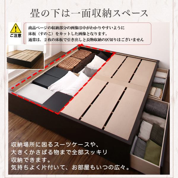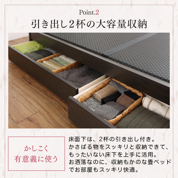 床面下は2杯の引出付き。かさばるものをすっきりと収納できて、もったいない床下スペースを上手に有効活用できます。