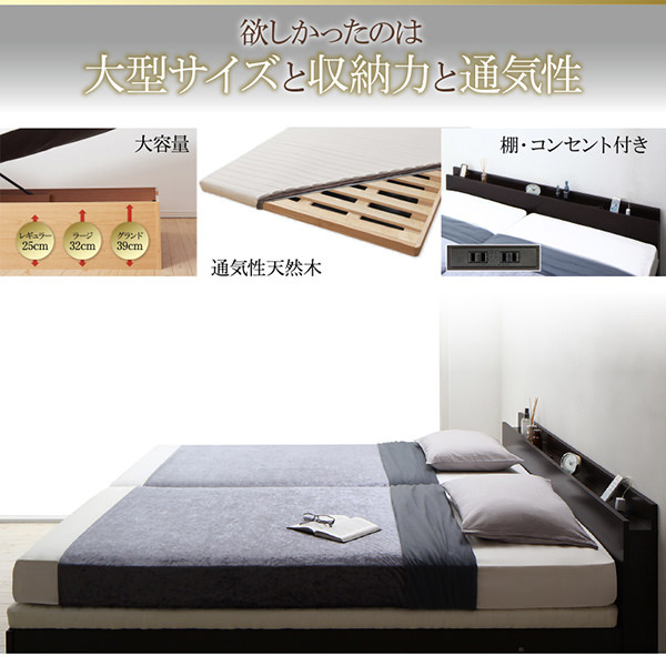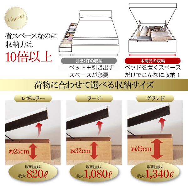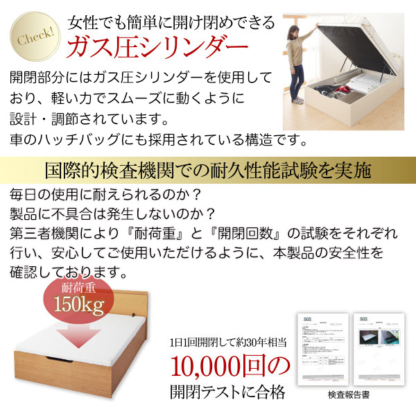 跳ね上げベッド【S-Breath】エスブレスは、すのこすのこ仕様の最大収納量1,340リットルの大容量収納跳ね上げベッド。空気を通す天然木床板がほこりやダニから荷物や寝具を守ります。この商品は、薄型スタンダードボンネルマットレス付 クイーン(SS×2) レギュラータイプです。