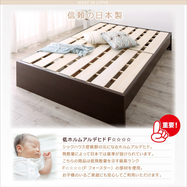すのこは国産の安心仕様。調湿作用の優れた桐を使用しており、通気性を良くしています。耐荷重に優れたすのこなので、布団も使用する事ができます。