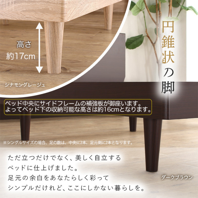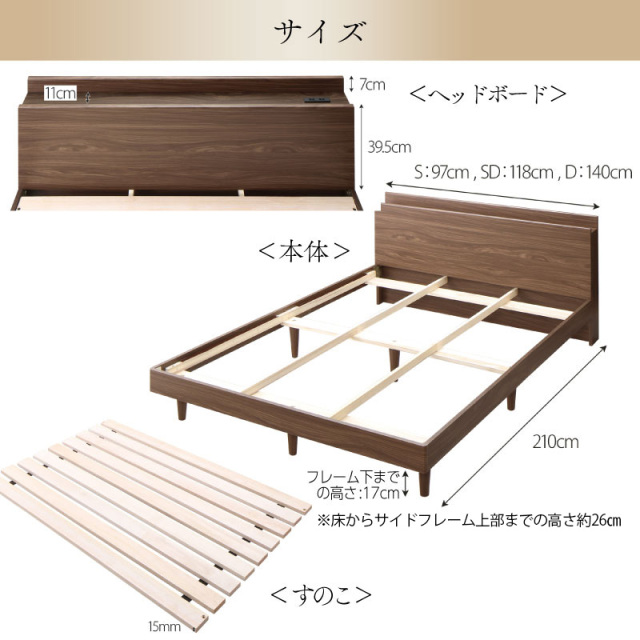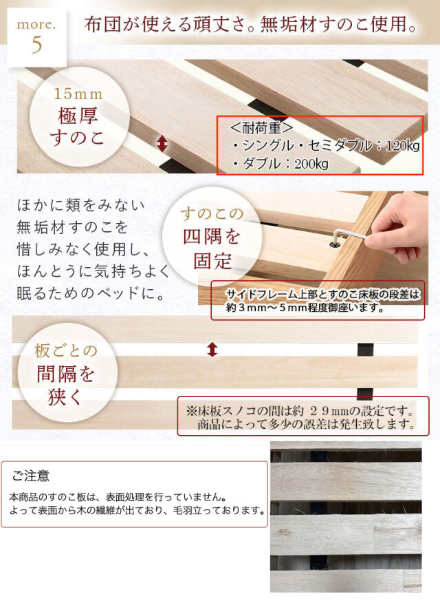無垢すのこ採用のすのこベッド、極厚15mmのすのこ採用、四隅をボルトで固定することで軋みが少なく軋み防止フェルト付き、板ごとの間隔を狭く設計しました。この商品は、敷布団付 セミダブルサイズです。