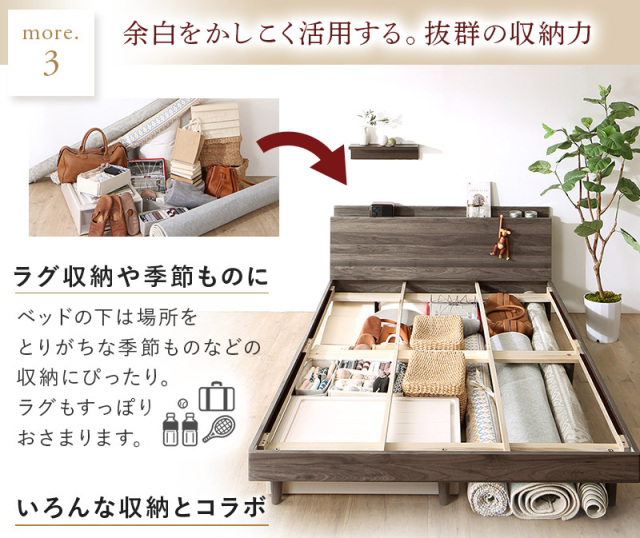 ベッド下には、場所をとりがちな季節物などの収納にピッタリ。