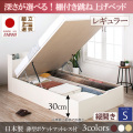 日本製 大容量 棚付き 跳ね上げベッドは、開閉が縦・横を選べる日本製跳ね上げ式収納付きベッドです。さらに収納庫の深さが選べます。引き出し付きのチェストベッドと比べ約2倍の収納力です。この商品は、【日本製薄型ポケットマットレス付】縦開き シングル 深さレギュラータイプです。
