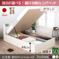 日本製 大容量 棚付き 跳ね上げベッドは、開閉が縦・横を選べる日本製跳ね上げ式収納付きベッドです。さらに収納庫の深さが選べます。引き出し付きのチェストベッドと比べ約2倍の収納力です。この商品は、【日本製薄型ポケットマットレス付】縦開き セミダブル 深さグランドタイプです。