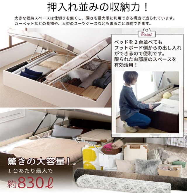 - 驚異の収納力・最大830L!ベッド下が一面収納の跳ね上げベッド