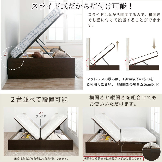 スライド方式を採用することによって、縦型はヘッドボードにマットレスがあたらず、横型は、壁際に設置しても、壁にぶつかりません。