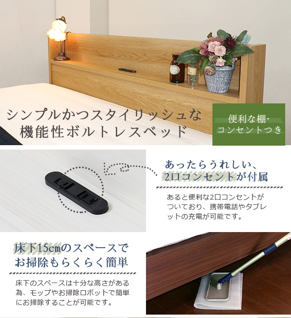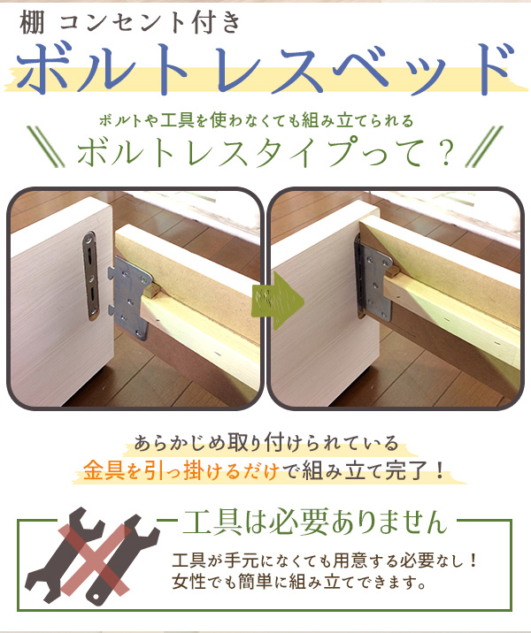日本製 棚・コンセント付 ボルトレスベッドは、工具がいらない組立簡単ベッドです。ヘッドボードにはコンセント付き、この商品は、シングル フレームのみとなります。